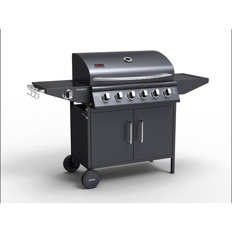 Velký plynový gril se šesti hořáky za skvělou cenu – to je model Florida od německé společnosti Activa. Skvěle se hodí pro chutnou a rychlou přípravu jídel pro společnost až 12 lidí. Základem vysokého výkonu je šest moderních výkonných plochých hořáků s horním krytem, díky kterému je odkapávající tuk veden mimo plamen a odveden do speciální nádržky. Pokrm tak bude vždy zdravý bez zbytečných škodlivých prvků, které vznikají přepalováním tuku. Gril má rovněž praktický integrovaný boční vařič vhodný na přípravu omáček, horkých nápojů nebo příloh. Hořáky se pohodlně zapalují pomocí piezo zapalování integrovaného v otočných knoflících. Gril je dále vybaven kvalitním dvoudílným smaltovaným litinovým grilovacím roštem kombinovaným s litinovou ohřívací deskou a dalším vyklápěcím roštem, který je vhodný na nepřímé grilování masa či zeleniny anebo na ohřívání již ugrilovaných pokrmů. Gril má kvalitně lakované víko s velkým nerezovým madlem a zabudovaným teploměrem, dvě odkládací poličky na každé straně s madly vhodnými na pověšení grilovacího náčiní a praktický odkládací prostor pod grilem, který je přístupný dvířky zepředu. Pro snadný transport je vybaven kolečky. Na rozdíl od mnoha jiných grilů je již v základu vybaven vším potřebným pro připojení k plynové lahvi 5 nebo 10 kg. Gril je vybaven integrovanýmdržákem plynové bomby.