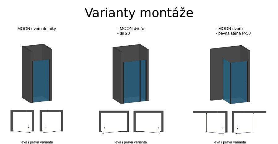 Otvárajú sa smerom do priestoru. Tvrdené bezpečnostné číre sklo týchto sprchových dverí je vsadené do elegantného lešteného ALU rámu. Výhodou sprchových dverí do niky MOON 70 je určite nastaviteľná šírka. Tak sú ideálne pre nepresne postavené niky.