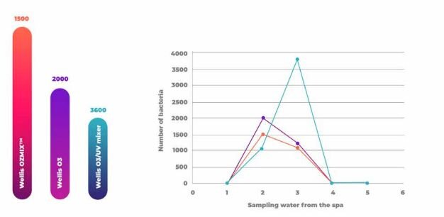 systém Ozimix – ozónový generátor s mixérom, O 20 % účinnejšie ako používanie iba ozónu bez zmiešavacej komory. V porovnaní so systémami na dezinfekciu vody na trhu odstraňuje Ozmix™ z vody vo vírivke najviac baktérií. |