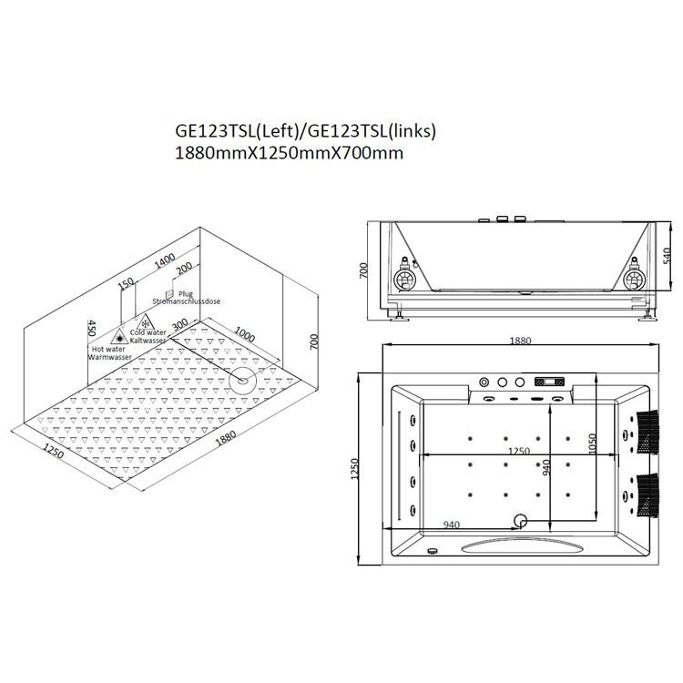 14 hydrojety (4 nastaviteľné trysky, 10 masážnych trysiek v oblasti chodidla / chrbta) v stene