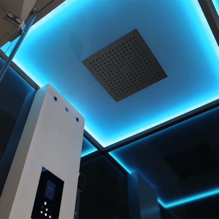 Náš nový ovládací panel F15 je navrhnutý tak, aby sa dal veľmi ľahko používať. V centre pozornosti je samozrejme funkcia parnej sauny s výberom teploty a času. Okrem toho ponúkame ďalšie funkcie, ako je dezinfekcia ozónom a funkcia čistenia a odvápnenia. Jedinečná je pre tento model obloha s nepriamym osvetlením. Farebné svetlo sa nemení prudko (ako pri iných modeloch), ale ponúka plynulé prechody.