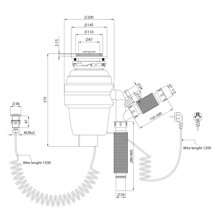 Drezový drvič kuchynského odpadu, 230V, 380W, pneumatický spínač