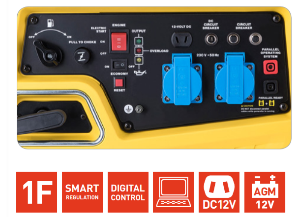 Digitálna invertorová elektrocentrála s kompaktnými rozmermi a stabilným výstupom vhodná na rekreačné využitie aj napájanie citlivej elektroniky. Podvozková sada uľahčuje prevoz a inteligentná regulácia otáčok pomáha znižovať spotrebu pri bežnom používaní. Elektrický štart zabezpečuje dobíjaný vstavaný AGM akumulátor.