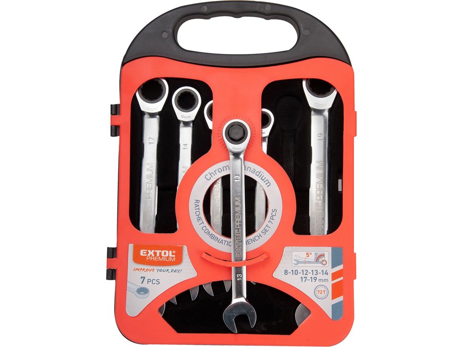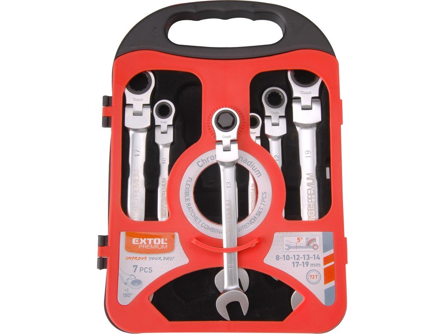 Kľúče očko-vidlicové, račňové, 72 zubov, s kĺbom, 7-dielna sada, 8-19mm, EXTOL PREMIUM