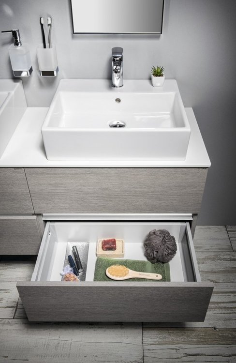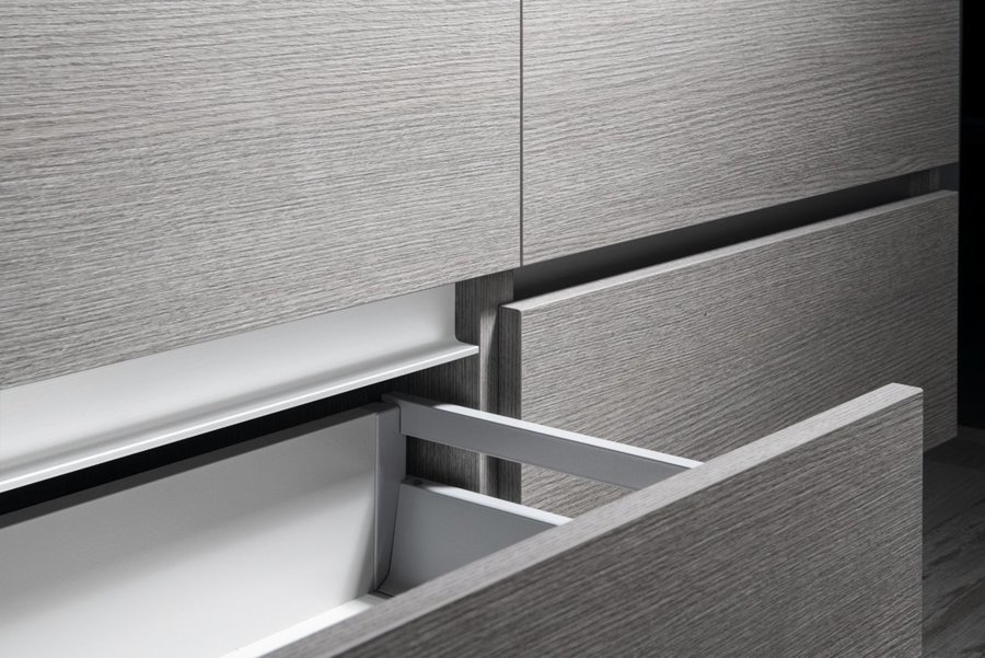 Nábytok je vybavený pojazdy zásuviek s pomalým dojazdom a systémom automatického dovretí zásuviek. Už žiadne hlučné zatváranie.