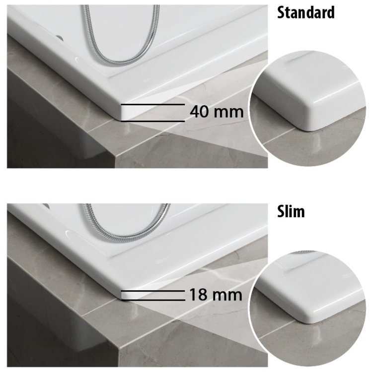 Vaňa má oproti štandardným vaniam výšku hrany okraja iba 18 mm. Pri obmurovanie tak pôsobí estetickejšie. Nemožno ju inštalovať s obkladovým panelom.
