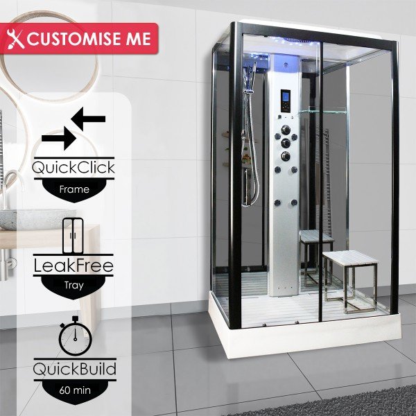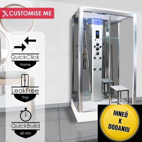 Zvýšte svoj blahobyt ešte viac vďaka funkcii trojprúdovej pary a rýchlemu spusteniu 2,8 kW parného generátora, ktorý naplní kabínu parou v priebehu niekoľkých minút, zatiaľ čo termostatický ventil udržuje konštantnú teplotu v kabíne, takže si môžete vychutnať úplne vyvážené prostredie ,