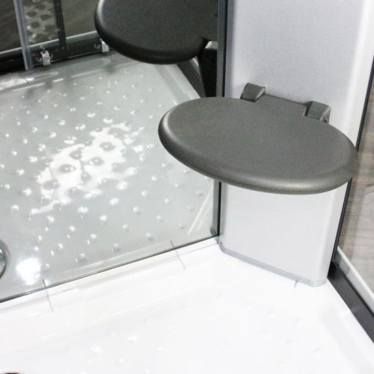 Monzúnová stropná sprcha ponorí vaše telo do upokojujúcej vody, aby upokojila vaše telo a zmiernila napätie odo dňa. Alternatívne je k dispozícii multifunkčná ručná sprcha s tromi nastaveniami tlaku na ľahko ovládateľnej koľajnici pre optimálne nastavenie výšky a manévrovateľnosť. Sadnite si na sklopné čalúnené sedadlo a vychutnajte si 12 relaxačných trysiek určených na jemnú masáž tela, ktoré podporujú zdravší krvný obeh.