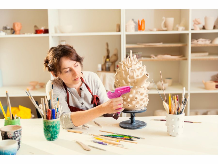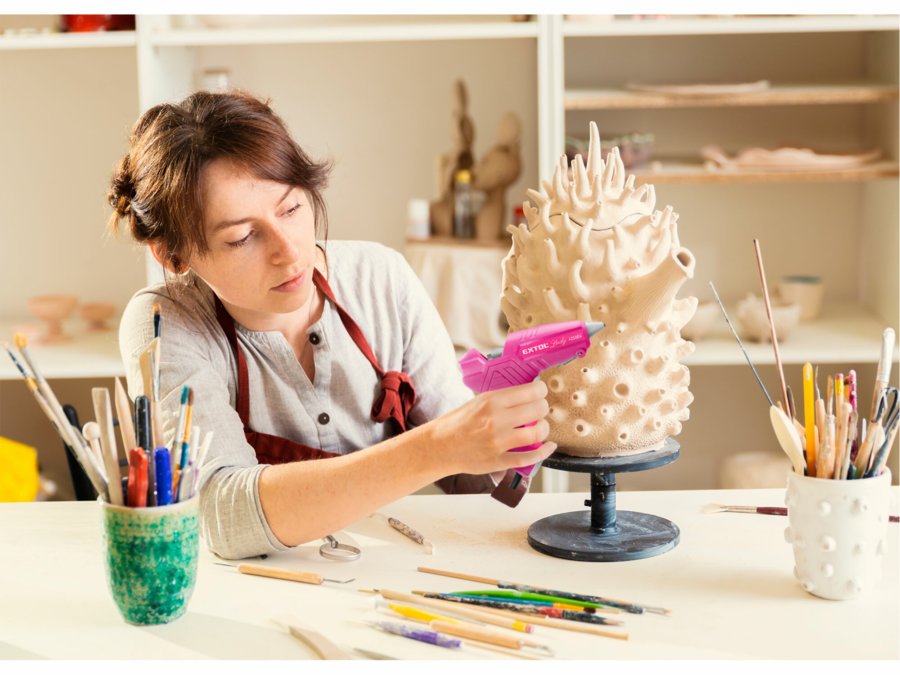Lepiaca tavná pištoľ určená na rýchle lepenie papiera, korku, dreva, kože, textílie, umelej hmoty, keramiky a pod. Páčka mechanického posuvu umožňuje citlivé, plynulé a presné dávkovanie roztaveného lepidla.