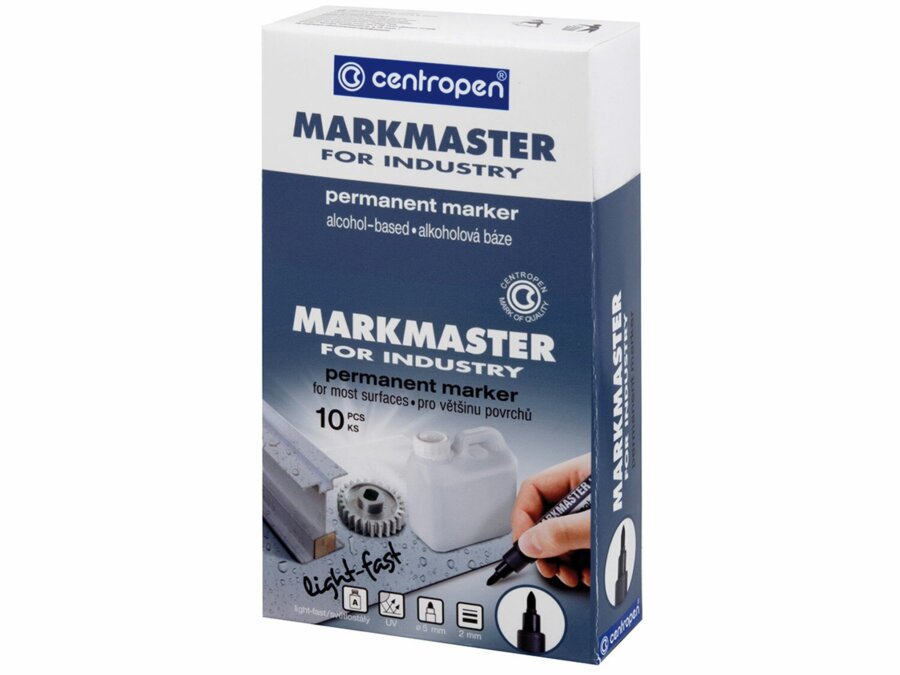 Univerzálny čierny svetlostály popisovač s okrúhlym hrotom a s vysoko permanentným atramentom na alkoholovej báze, vhodný na väčšinu povrchov. Odolá vode, poveternostným podmienkam aj oderu.