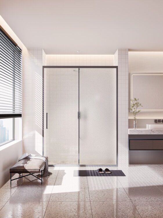 Praktické posuvné sprchové dvere s čiernym rámom a matným bezpečnostným sklom. Rozmer 100cm.