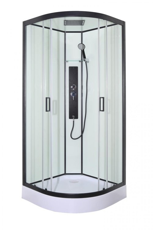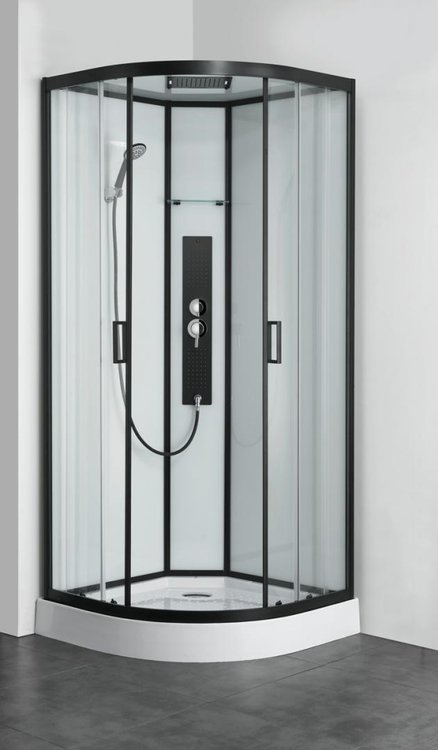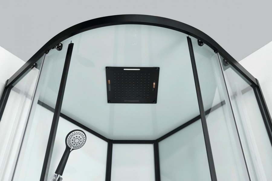 Biela sklenená strecha s dizajnovou čiernou hlavovou sprchou