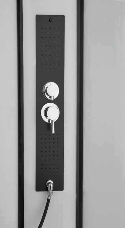 Sklenený panel s masážnými trýskami uložený v čiernom kryte z nehrdzavejúcej ocele