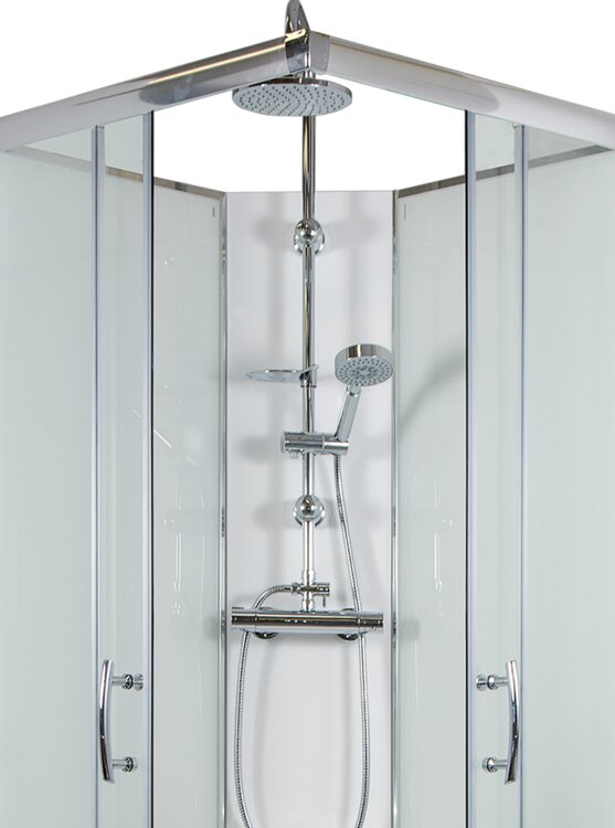 Sprchový box ARTTEC SMARAGD THERMO MODEL 7 chinchila, vlastnej výroby, s posuvnými dverami štvorcový sa vyznačuje vysokou kvalitou a jednoduchým dizajnom. Pre komfortné sprchovanie ponúka vo výbave THERMO SET, ktorý sa skladá z THERMO batérie, ručné sprchy na posuvnom držiaku, horné sprchy a mydlovničky. Súčasťou sprchového boxu je tiež polička na šampón, vstavané sedátko a vanička z liateho mramoru.