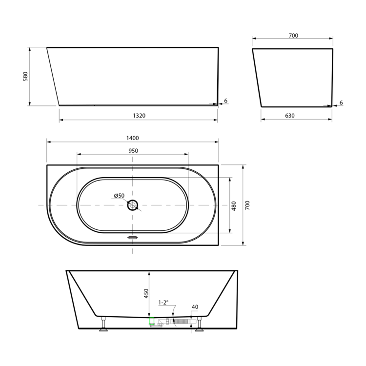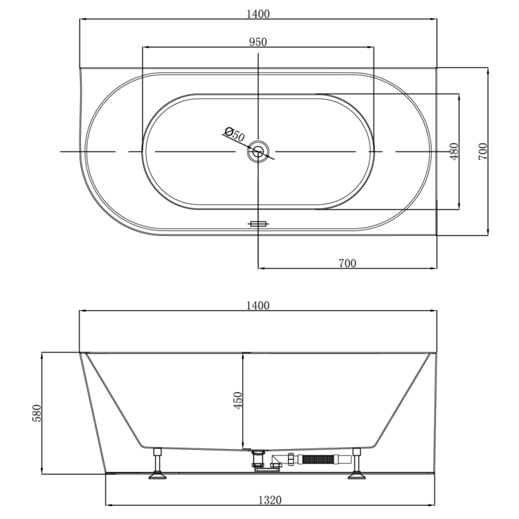 Súčasťou vane je prepadová súprava, výpusť s click-clack zátkou a sifón